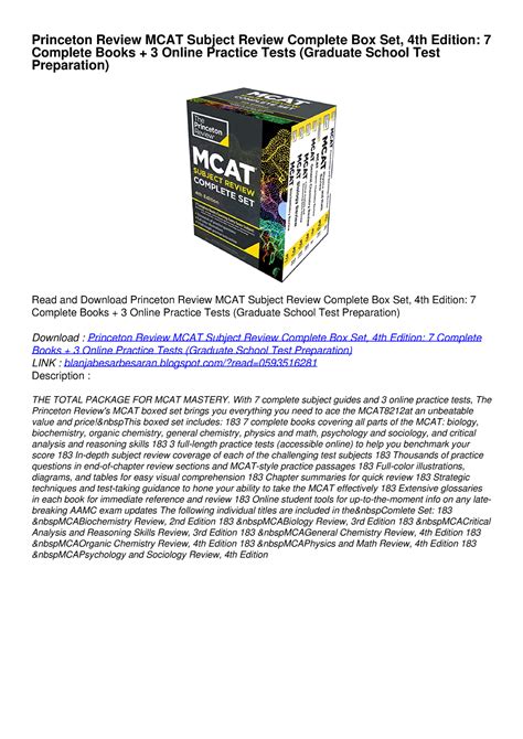 Read Online Download Princeton Review MCAT Subject Review Complete Set PDF.rar Doc online is a convenient and frugal way to read Download Princeton Review MCAT Subject Review Complete Set PDF.rar you love right from the comfort of your own home. Yes, there sites where you can get Doc "for free" but the ones listed below are clean from viruses and completely legal to use.